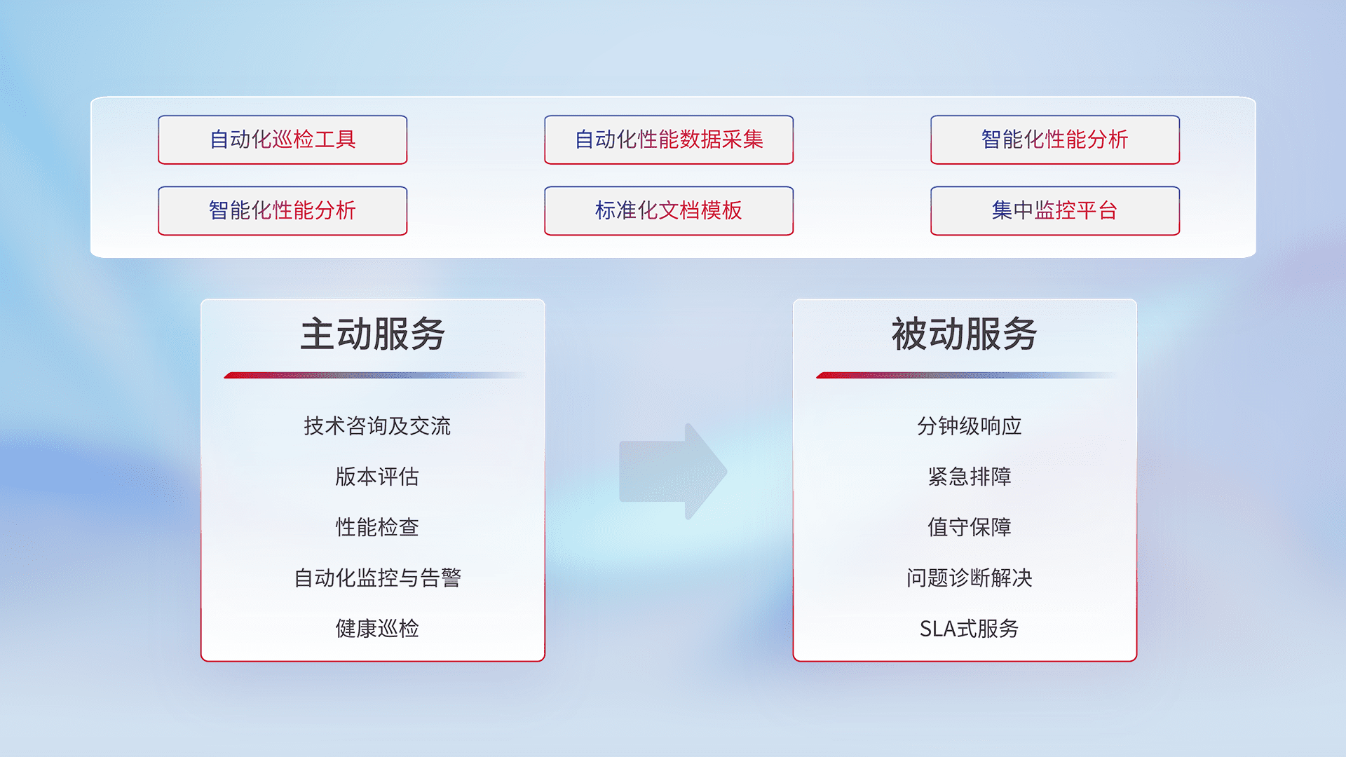 智能化工具和标准化文档,,,,保障服务质量,,,提供主动服务(包含技术咨询、、、版本评估、、性能检查、、、自动化监控与告警、、、、健康巡检)和被动服务包含(分钟级响应、、、、紧急排障、、、值守保障、、问题诊断解决、、SLA服务)。。。。